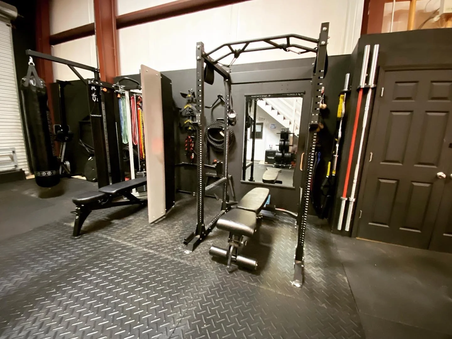 Weight rack, weights, Pilates Reformer Table, heavy bag area, various training equipment, puzzle mats